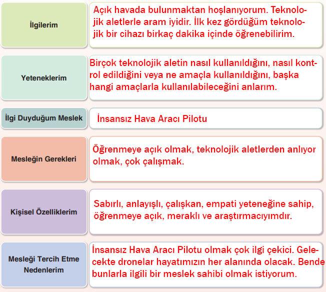 A. Dünyadaki gelişmelerle ortaya çıkan yeni meslekleri dikkate alarak mesleki tercihlerinize göre planlama yapınız. Bunun için ilgilerinizi, yeteneklerinizi, kişisel özelliklerinizi belirtiniz. İlgi duyduğunuz mesleğin gereklerini ve bu mesleği tercih etme nedenlerinizi yazınız.