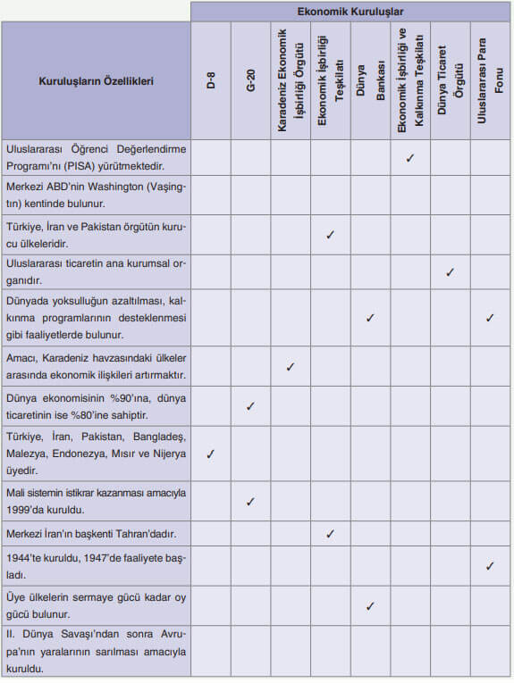 B. Aşağıdaki tabloda Türkiye’nin ilişkide olduğu ekonomik kuruluşlar ve bunların özellikleri verilmiştir. Bu kuruluşlarla faaliyetlerini ilgili kutucukları işaretleyerek eşleştiriniz.