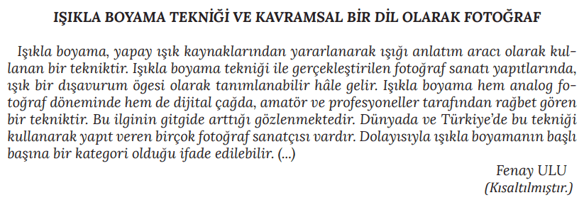 B) Aşağıda ışıkla boyama tekniği ile çekilmiş bir fotoğraf yer almaktadır. Bu fotoğraftan hareketle “sanatın yaşamımızdaki yeri ve önemi” ile ilgili bir konuşma yapınız.