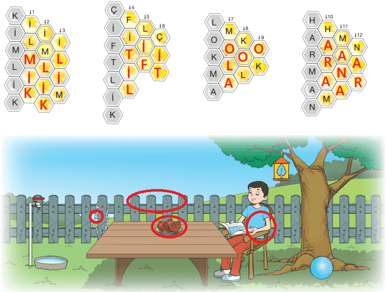 Metinden alınan “kimlik, çiftlik, lokma, harman” sözcüklerinden yeni kelimeler türeterek bu sözcükleri okun gösterdiği yönde ilgili kutulara yazınız. Bu sözcüklerden 1, 2, 4, 6, 8 ve 12 numaralı olanları görselden bularak işaretleyiniz.
