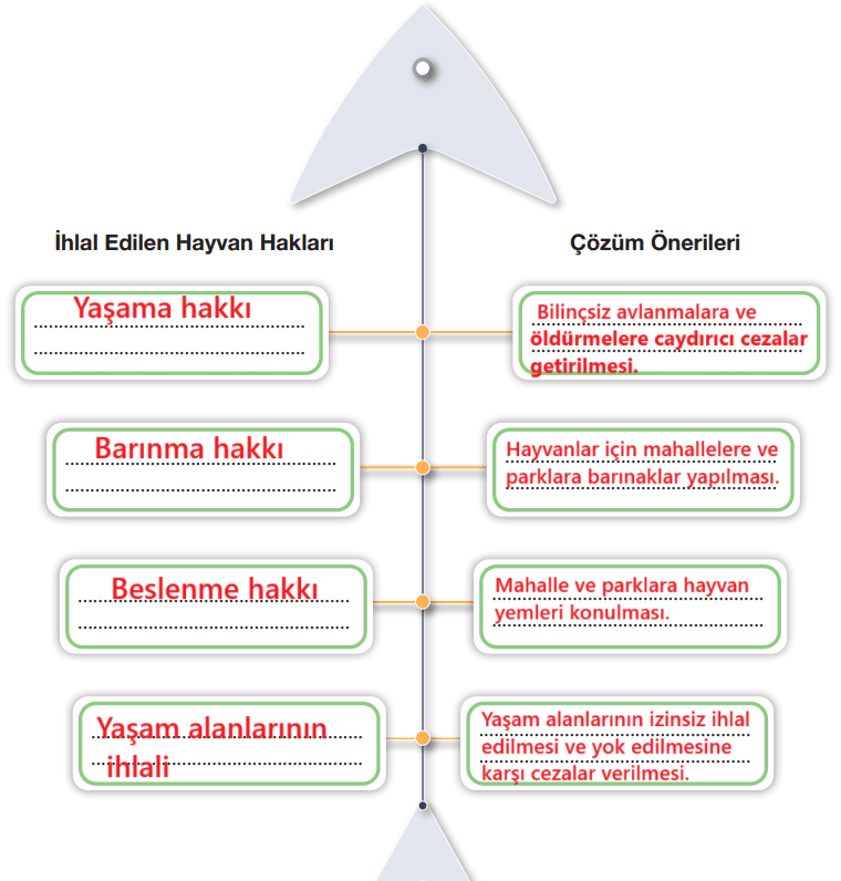 Günlük hayatta hayvanların ihlal edilen haklarını, aşağıda verilen balık kılçığının solundaki kutucuklara yazınız. Balık kılçığının sağındaki kutucuklara ise bu hakların ihlal edilmemesi adına neler yapılabileceğine dair çözüm önerilerinizi yazınız.