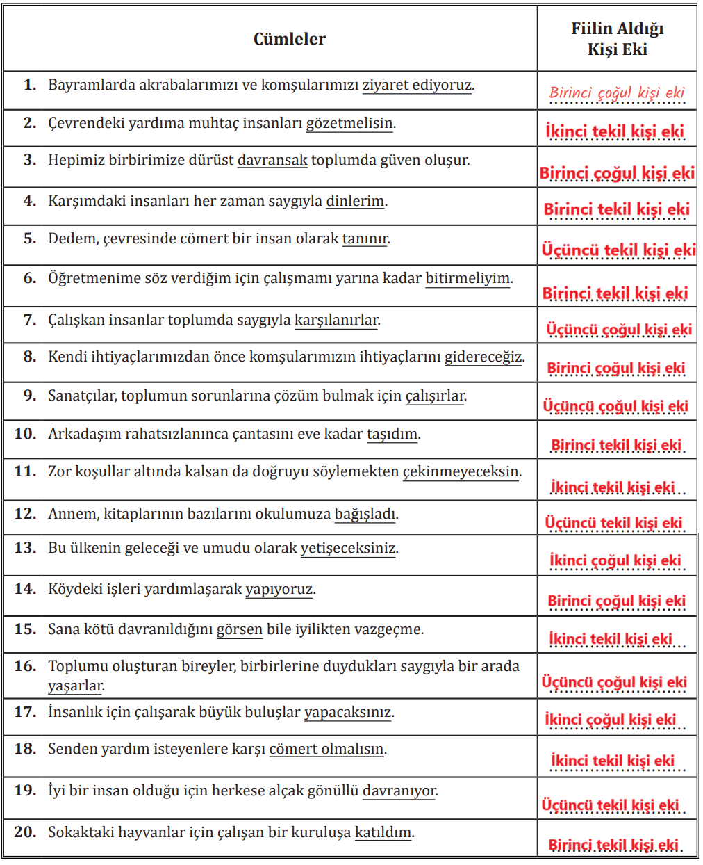 Aşağıdaki cümlelerde yer alan altı çizili fiillerin aldığı kişi ekini bularak tablodaki ilgili yere örnekteki gibi yazınız.