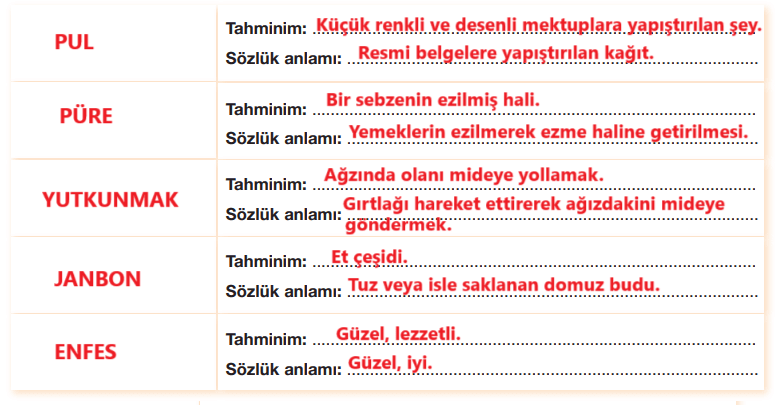 a) Metni dinlerken not aldığınız beş kelimenin anlamını tahmin ediniz. Bu kelimelerin anlamlarını Türkçe Sözlük’ten bulunuz. Tahminlerinizi sözlük anlamlarıyla karşılaştırınız.
