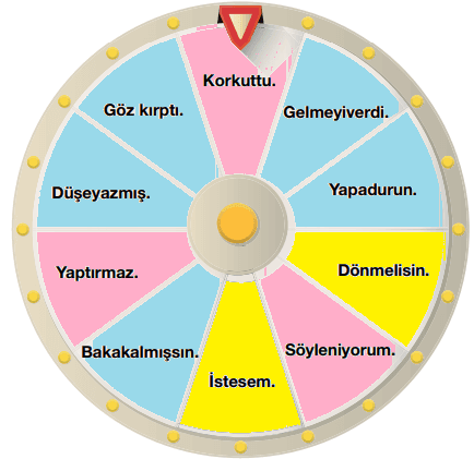 a) Aşağıdaki çarkta verilen fiilleri inceleyiniz. Fiillerin basit mi, türemiş mi yoksa birleşik mi olduğuna karar veriniz. Basit fiillerin olduğu dilimleri sarı, türemiş fiillerin olduğu dilimleri pembe, birleşik fiillerin olduğu dilimleri mavi ile boyayınız.