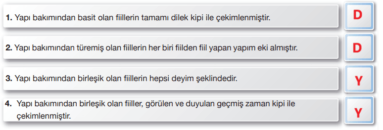 c) Çarktaki fiillerle ilgili aşağıda verilen ifadeler doğru ise yanındaki kutuya “D”, yanlış ise “Y” yazınız.