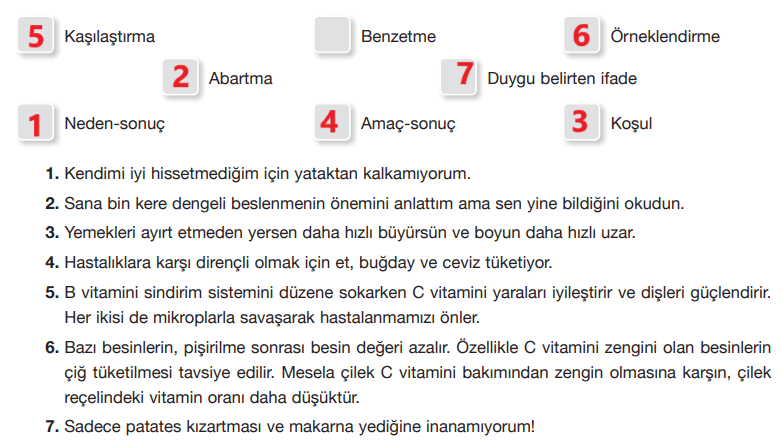 Aşağıdaki cümlelerde hangi anlam ilişkisinin yer aldığını belirleyerek cümlelere verilen numaraları uygun kutucuğun başına yazınız.