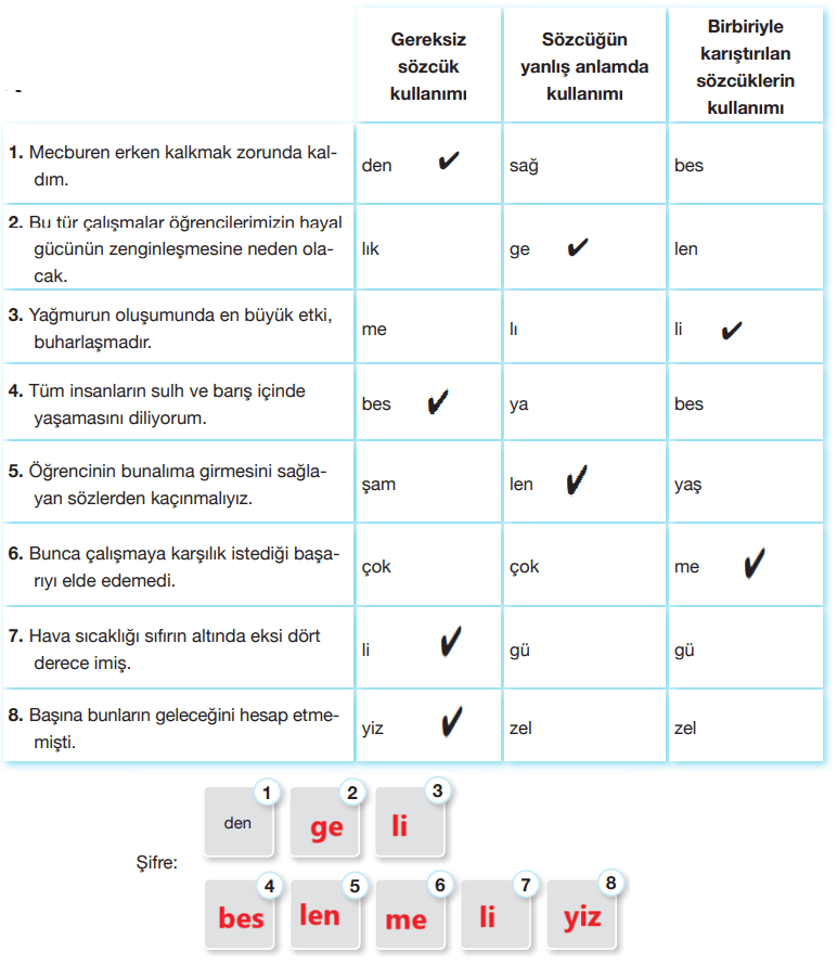 Aşağıdaki cümlelerde yer alan anlatım bozukluğunun sebebini tespit edip örnekteki gibi işaretleyiniz. Sebeplerin altındaki heceleri, ilgili sayının kutucuğuna yazarak şifreyi çözünüz.