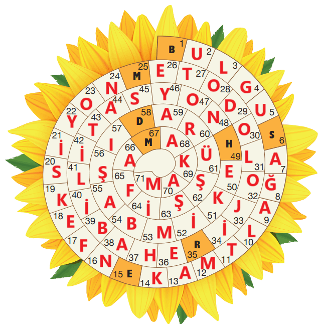 Metinde geçen bazı kelime ve kelime gruplarının anlamları aşağıda verilmiştir. Bunların neler olduğunu bularak sarmal bulmacada ilgili sayı aralığına yerleştiriniz.