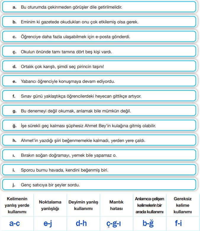 Aşağıdaki cümlelerde yer alan anlatım bozukluklarının sebebini bulup cümlelerin başındaki harfleri örnekteki gibi uygun kutucuğa yerleştiriniz.