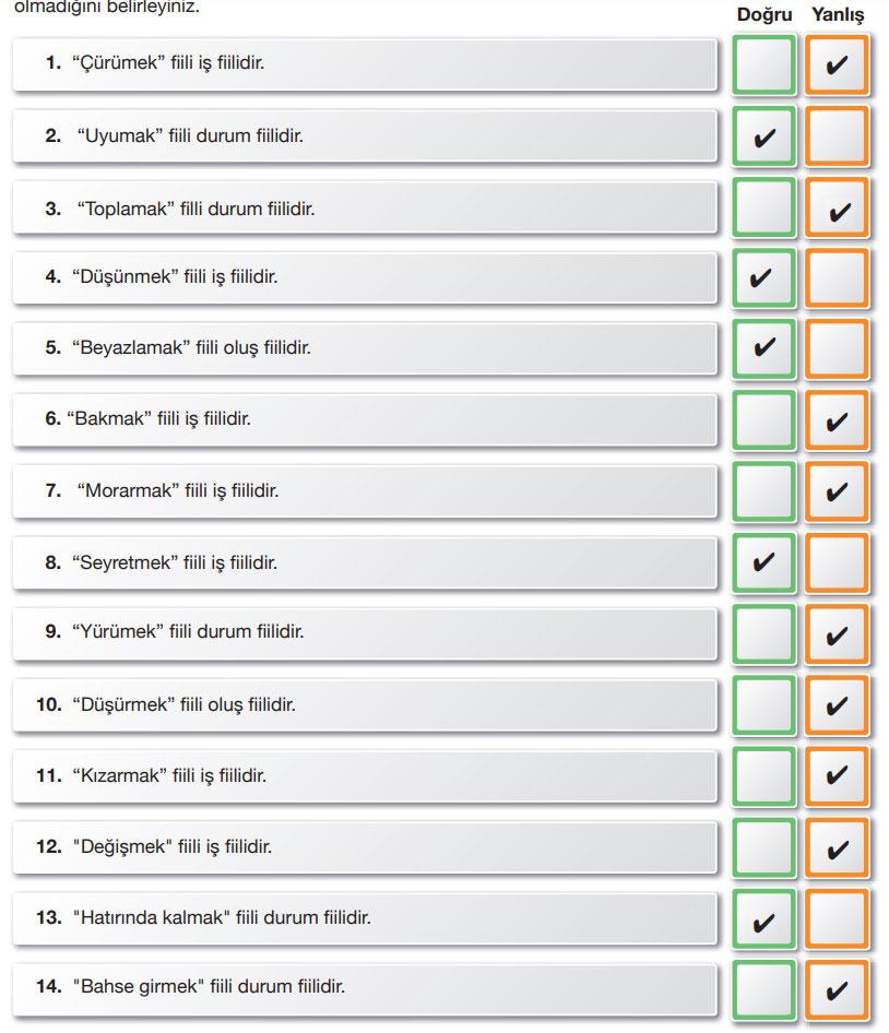 Aşağıdaki tabloda bazı fillerin anlam özellikleri ile ilgili bilgiler verilmiştir. Bu bilgilerin doğru olup olmadığını belirleyiniz.
