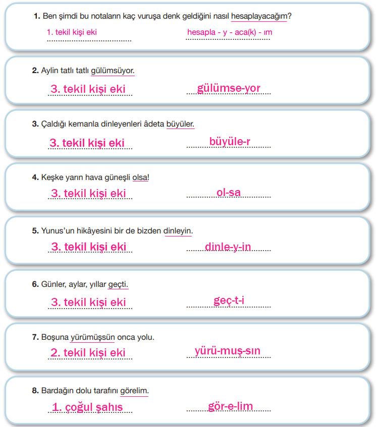 Aşağıdaki cümlelerde geçen çekimli fiillerin altını çizip aldıkları kişi eklerini örnekteki gibi gösteriniz.