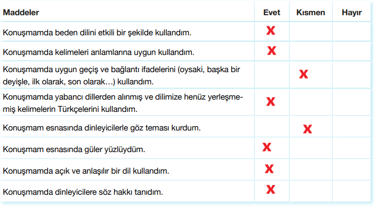 b) Konuşmanızı aşağıdaki öz değerlendirme formunda yer alan maddelere göre değerlendiriniz.
