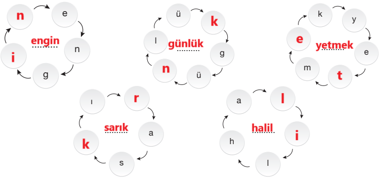 Harfleri saat yönünde veya tersi yönde okuduğunuzda bir kelime elde edebilecek şekilde tamamlayınız. Elde ettiğiniz kelimelerle boş bırakılan alana bir dörtlük yazınız.