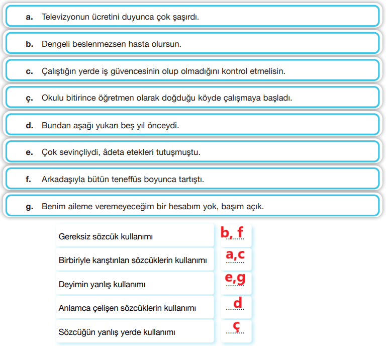 4. Aşağıdaki cümlelerde yer alan anlatım bozukluklarının sebebini tespit edip cümlelerin başındaki harfleri uygun kutulara yerleştiriniz.
