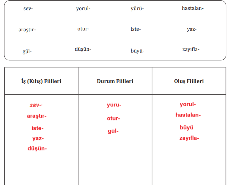 Aşağıdaki fiilleri, anlam özelliklerine göre ilgili başlıkların altına örnekteki gibi yazınız.