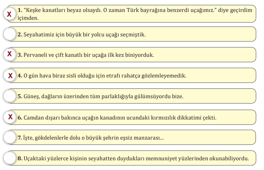 Verilen görselin altındaki cümlelerden hangileri bu görselden hareketle yazılmış bir hikâyede yer alabilir? Bu cümleleri belirleyerek yanlarına çarpı (X) işareti koyunuz.