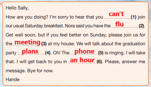 Çeviri: Sally’nin kısa mesajı yüksek sesle okumasını ve boşlukları doldurmasını dinleyin.