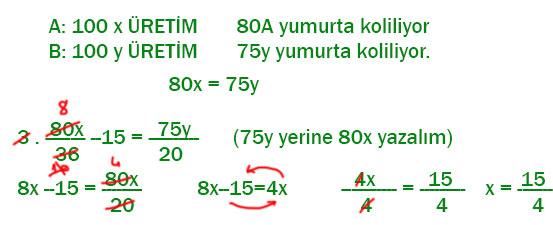 Gün sonunda iki firmanın kolilediği yumurta sayısı eşit ve B firmasının hazırladığı koli sayısı, A firmasının hazırladığı koli sayısının 3 katından 15 eksiktir.