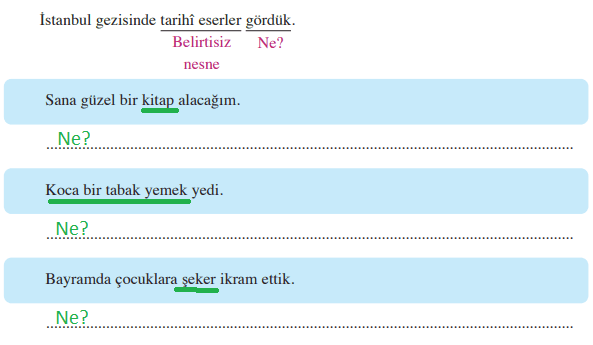 b) Aşağıdaki cümlelerin belirtisiz nesnelerini gösteriniz. Belirtisiz nesneyi bulmak için yükleme sorduğunuz soruyu yüklemin altına yazınız.